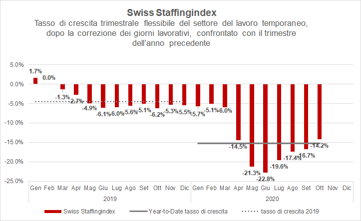 Tra agosto e ottobre, lo Swiss Staffingindex segna una contrazione del 14,2% delle ore di lavoro rispetto allo stesso periodo l'anno scorso. La ripresa sta dunque proseguendo, per quanto a rilento, anche se il settore resta nelle cifre rosse. Dall'inizio del 2020, è stato registrato un calo del 15,3% delle ore di impiego rispetto all'anno scorso.