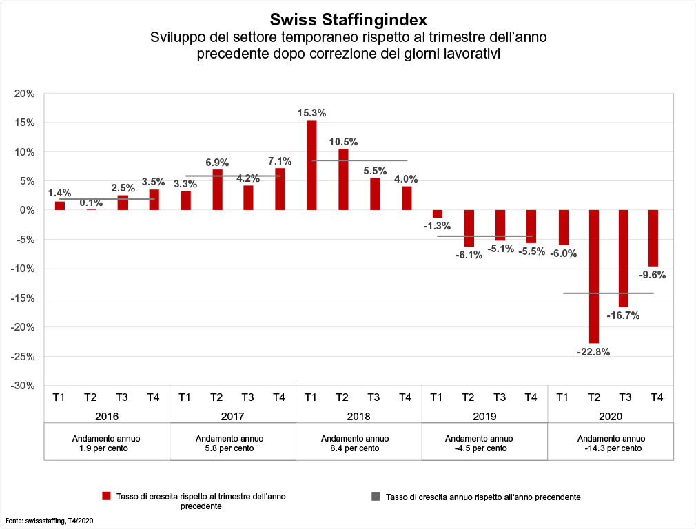 Nel 2020 le attività di lavoro temporaneo hanno subito un crollo pari al 14,3 % a causa della crisi legata al coronavirus. Dopo un calo del 22,8 % durante il primo lockdown, il declino del settore è migliorato costantemente nel corso dell'anno, toccando il 9,6 % nel quarto trimestre, come rivela chiaramente lo Swiss Staffingindex. La tendenza leggermente positiva nel corso dell'anno può essere ricondotta ai picchi di ordini nel settore della logistica e al clima di grande incertezza nelle aziende, che preferiscono affidarsi a personale flessibile anziché fisso. Il numero delle ore prestate dai lavoratori temporanei precipita, tuttavia, al suo livello più basso dall'inizio della misurazione nel 2012.