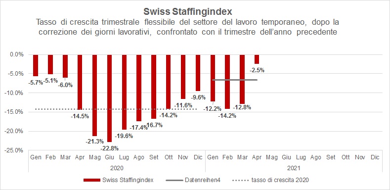 Tra febbraio e aprile, lo Swiss Staffingindex segna una contrazione del 2,5% delle ore di lavoro rispetto allo stesso periodo l'anno precedente, dall'inizio dell'anno del 6,7%. Considerato che le prime misure per la lotta al coronavirus sono state adottate a marzo 2020, il periodo di confronto si trova quasi completamente in tempo di crisi. Il segno negativo della crescita del settore è dunque un po' meno rosso e, se sostenuto da una buona evoluzione economica, potrebbe trasformarsi in un segno positivo.