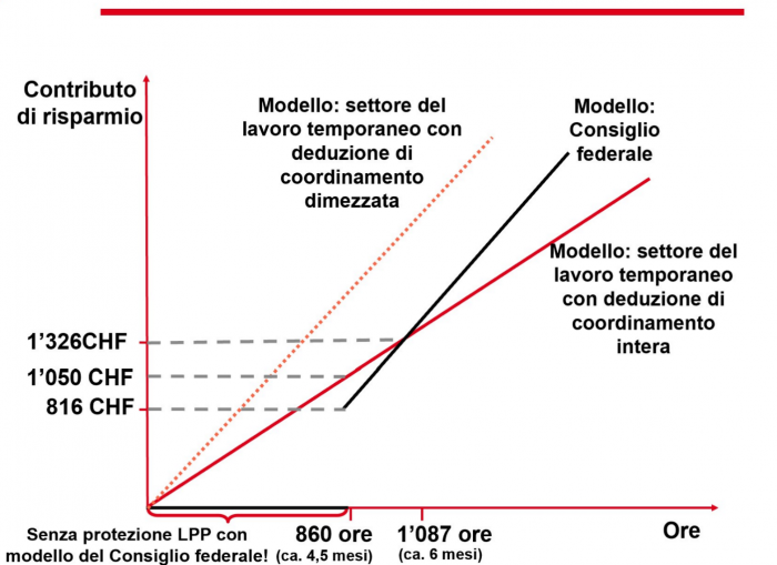 Il modello proposto dalla riforma, infatti, non prevede alcuna protezione assicurativa per i rapporti di lavoro fino a circa quattro mesi e mezzo, senza contare che l'effetto positivo della riduzione della deduzione di coordinamento incomincia a farsi sentire sui risparmi accumulati solo dopo circa sei mesi (vedi grafico). Ciò significa che chi svolge impieghi inferiori a sei mesi presso un datore di lavoro accumulerebbe meno avere di vecchiaia rispetto a quanto fa ora con il modello per il settore temporaneo e resterebbe in parte addirittura senza copertura assicurativa contro invalidità o decesso.