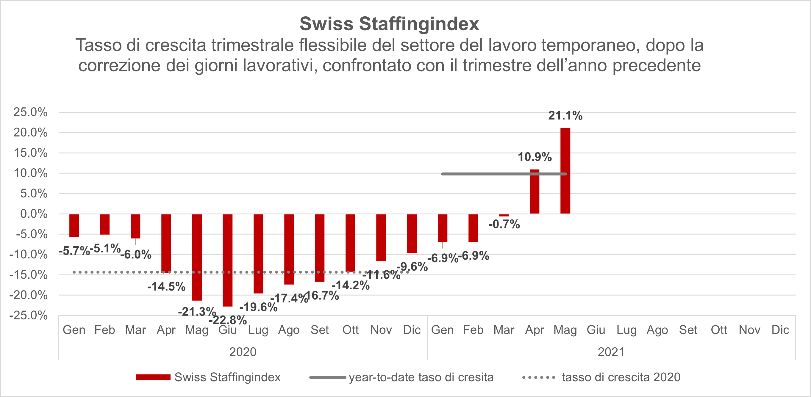Lo Swiss Staffingindex ha fatto segnare un aumento del 21,1% nel confronto tra il periodo marzo-maggio 2020 e 2021, un incremento repentino che potrebbe stupire, senonché a causa di un errore tecnico le ore di impiego notificate erano troppo basse dall'inizio dell'anno. I nuovi valori mostrano che in realtà il settore si era già avvicinato nel mese di marzo al livello dell'anno precedente e da allora è cresciuto ancora sensibilmente. Dall'inizio dell'anno, l'aumento è stato del 9,8%.