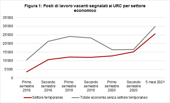 Nota: Il grafico mostra un confronto tra i posti di lavoro segnalati ai URC per il prestito di personale e per gli altri settori dell'economia.
