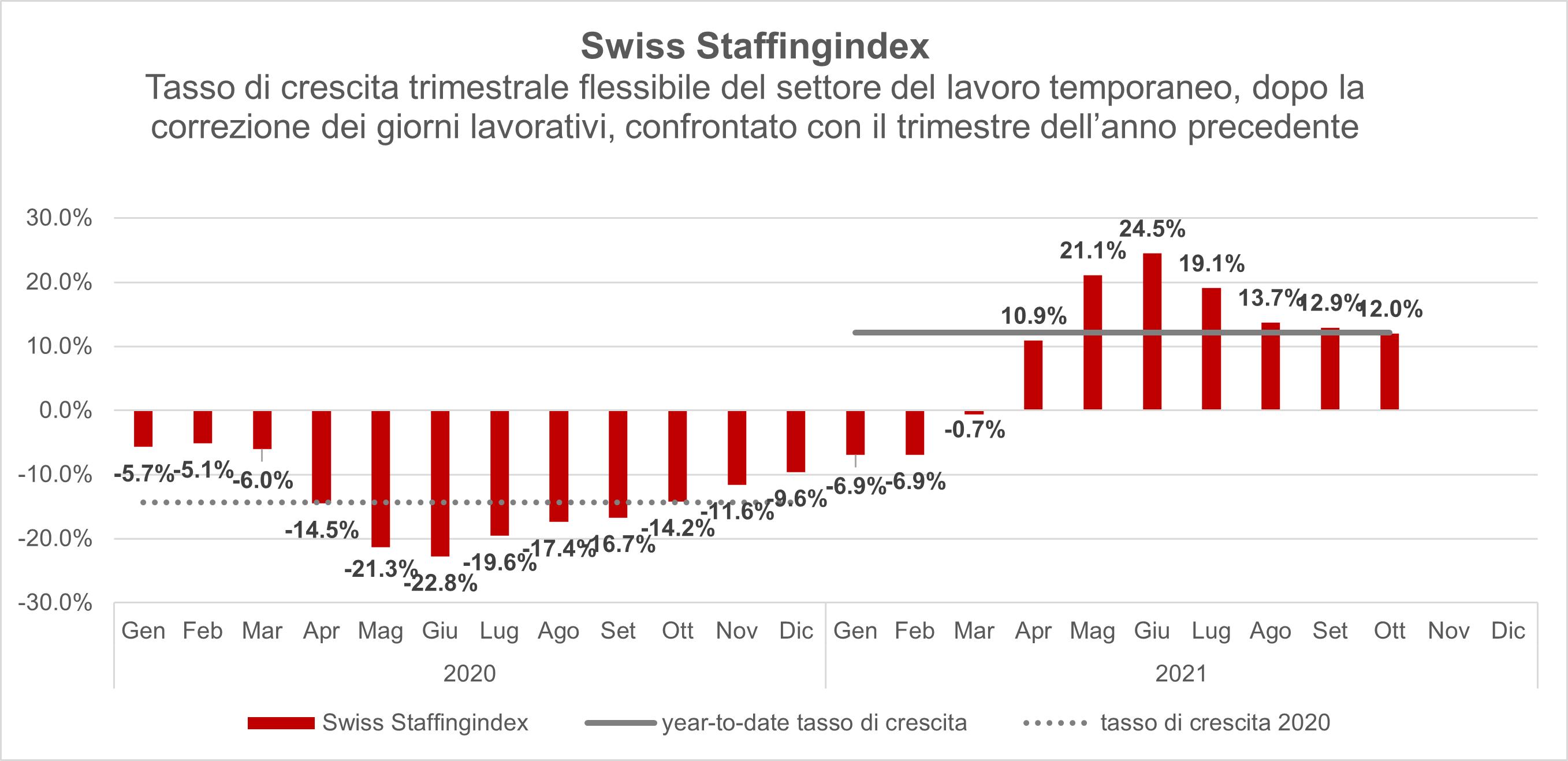 Il settore del lavoro temporaneo continua a recuperare terreno dopo le perdite riconducibili alla pandemia di coronavirus. Nei mesi di agosto, settembre e ottobre 2021, lo Swiss Staffingindex è aumentato del 12% rispetto allo stesso periodo l'anno scorso. Dall'inizio dell'anno, la crescita è pari al 12,1%. Considerato il calo del 14,3% subìto nel 2020, la ripresa dovrebbe proseguire anche nel 2022 per ritornare ai livelli precedenti alla crisi sanitaria.