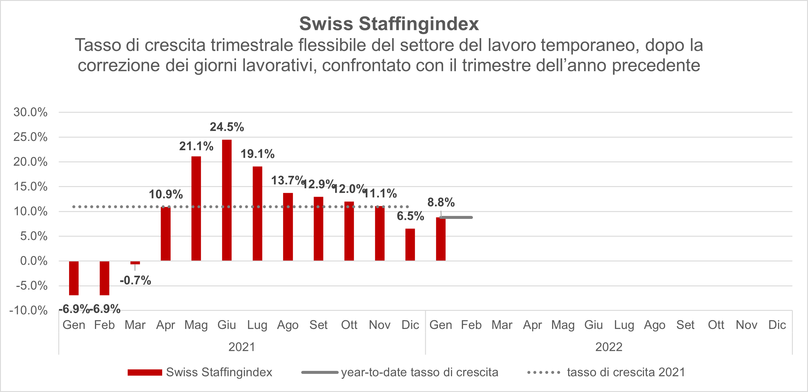 Il settore del lavoro temporaneo ha iniziato il 2022 in modo rallegrante. Per i mesi di novembre e dicembre 2021, e gennaio 2022 lo Swiss Staffingindex rileva infatti una crescita dell'8,8% rispetto allo stesso periodo dell'anno precedente. Il solo gennaio ha fatto registrare un aumento dell'8,5%. Il settore prosegue quindi sulla strada del ritorno ai massimi livelli.