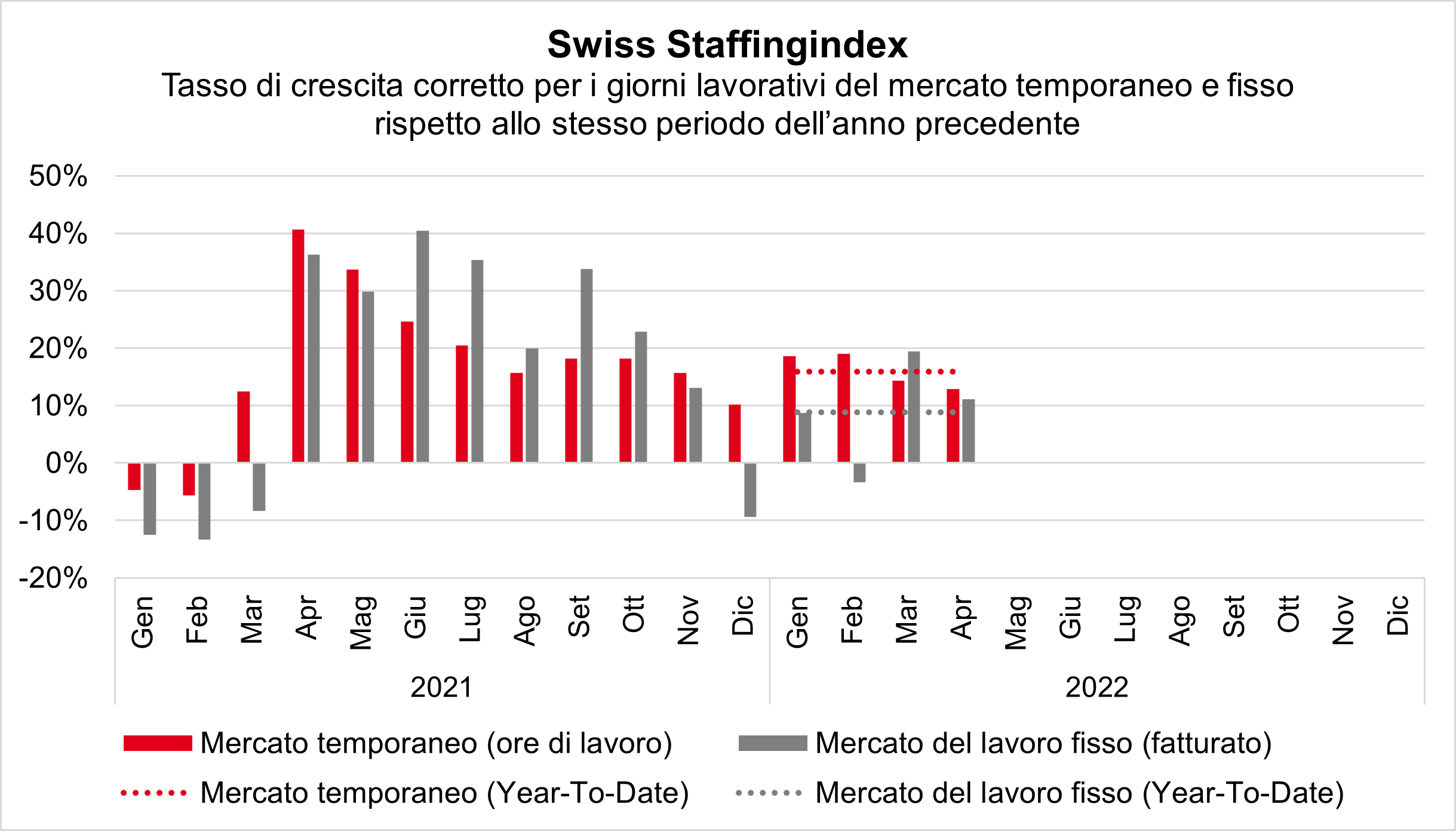 Nell'aprile 2022 l'attività dei prestatori di personale ha registrato uno sviluppo significativo. Le ore di lavoro prestate nel mercato temporaneo sono aumentate del 12,9 per cento rispetto allo stesso mese dell'anno scorso. Il fatturato con i collocamenti permanenti è stato del 11,1 per cento superiore al livello dell'anno precedente. I crescenti rischi economici globali come la guerra in Ucraina, le strozzature dell'offerta dalla Cina e l'aumento dei tassi di interesse non sono ancora riusciti a rallentare lo sviluppo positivo del mercato.