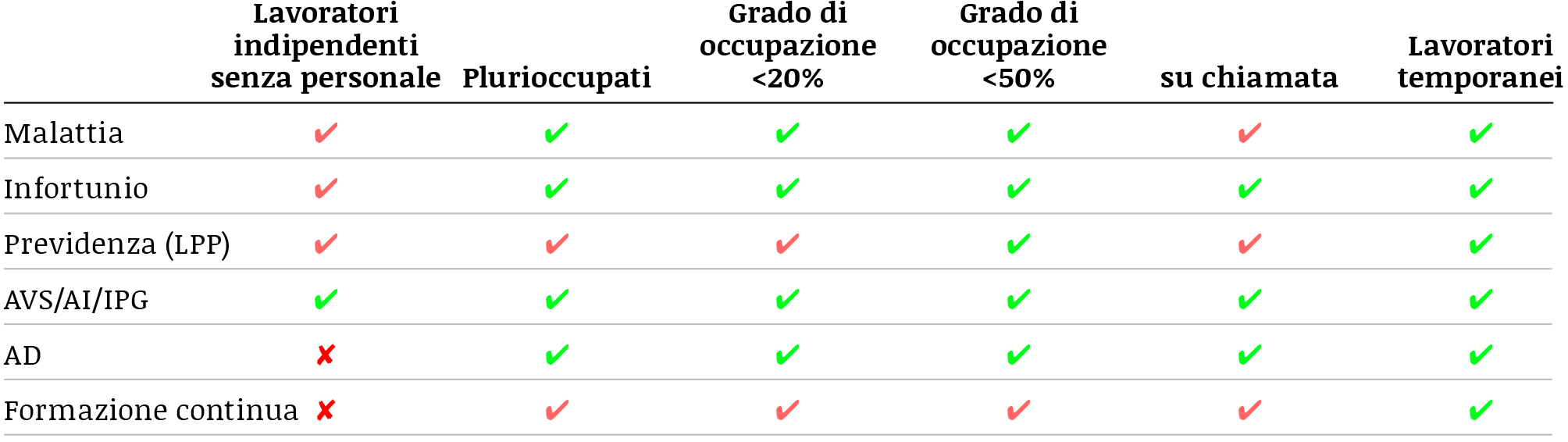 Per gli indipendenti determinate assicurazioni non sono obbligatorie (Previdenza/LPP) o non sono stipulabili (assicurazione contro la disoccupazione) o sono quasi impossibili da finanziare (assicurazione d'indennità giornaliera per malattia). Per i plurioccupati sussiste il rischio di gravi lacune nella previdenza professionale (cassa pensioni) a causa della soglia d'entrata LPP di 21'510 franchi e la deduzione di coordinamento. La previdenza professionale consente di mantenere un determinato tenore di vita in età avanzata, oltre a coprire rischi come la morte e l'invalidità. Una situazione con la quale devono confrontarsi anche le persone con un basso grado di occupazione e i lavoratori a chiamata. Questi ultimi spesso non sono assicurati in caso di malattia.