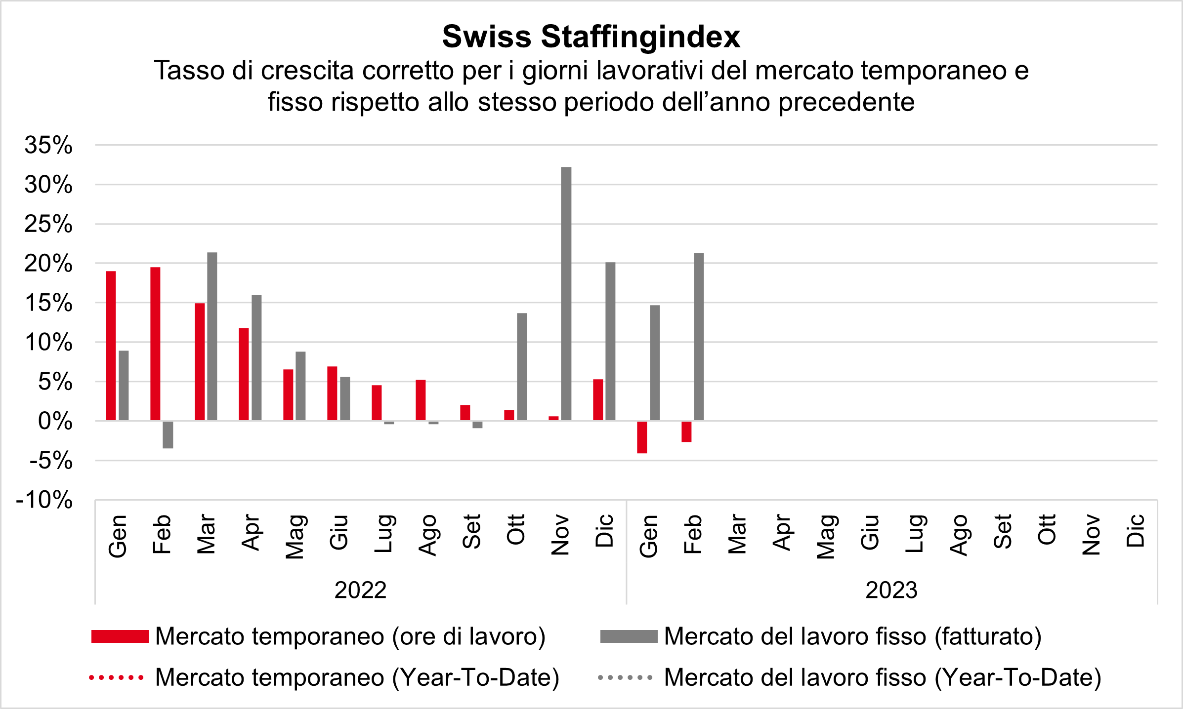 A febbraio, lo Swiss Staffingindex ha segnato un netto calo nel settore del collocamento temporaneo: il numero delle ore di lavoro prestate è diminuito del 2,7 per cento rispetto all'anno precedente. Il settore del collocamento a tempo indeterminato, invece, rimane in netto rialzo con un balzo del 21,3 per cento. Questa costellazione è il riflesso della situazione sul mercato del lavoro: non appena individuato un candidato idoneo, le aziende lo assumono direttamente a tempo indeterminato.