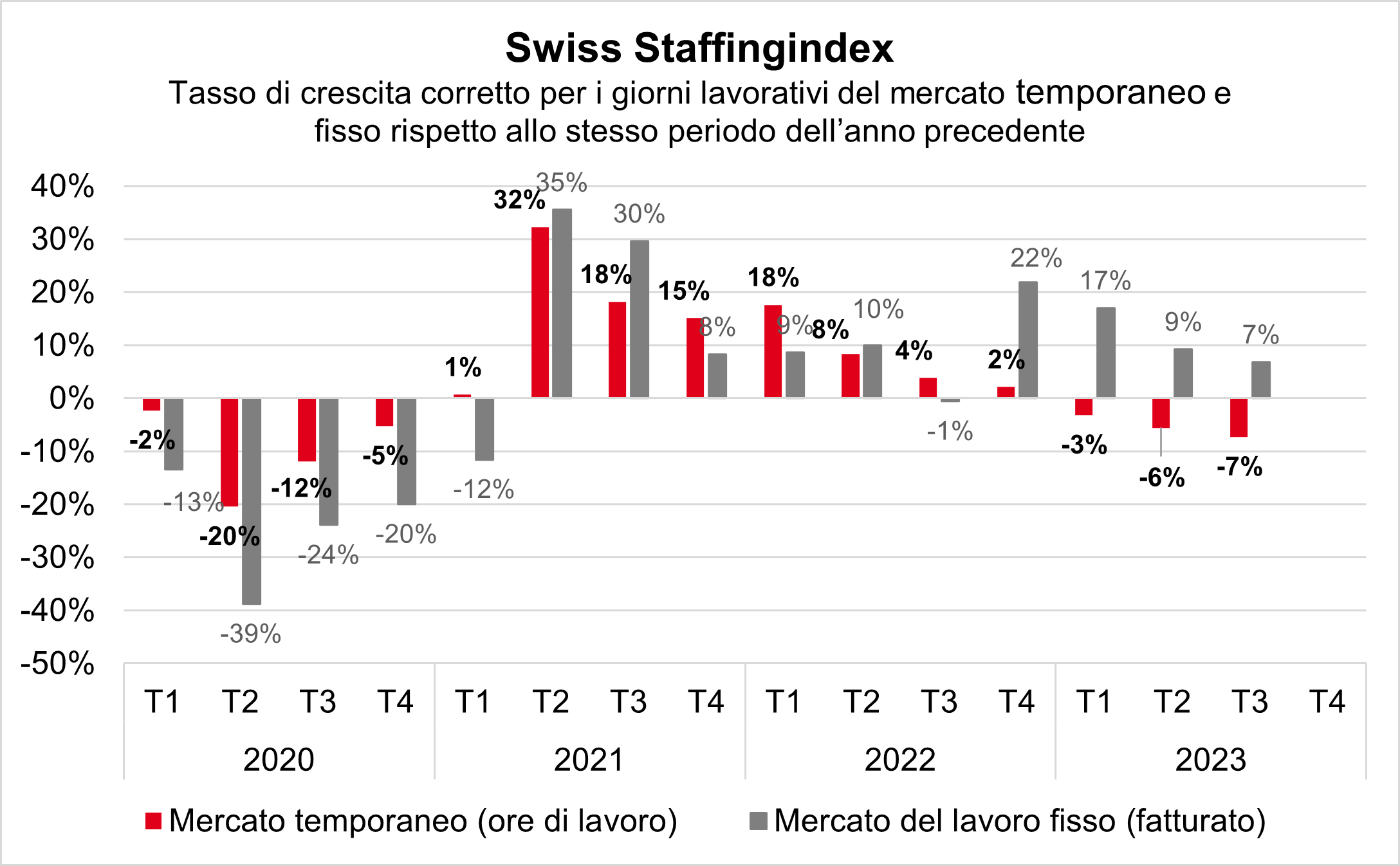 Stando allo Swiss Staffingindex, i prestatori di personale chiudono il terzo trimestre del 2023 nel settore del collocamento temporaneo con un calo del 7,6 per cento rispetto all'anno precedente. Viceversa, il fatturato generato con i posti fissi è aumentato del 6,8 per cento. La combinazione di carenza di manodopera e rallentamento della congiuntura rendono la vita difficile alle agenzie di lavoro temporaneo. Non si trovano i candidati idonei per i posti vacanti. Nell'industria, la domanda di personale temporaneo diminuisce insieme al portafoglio ordini. Il business del collocamento a tempo indeterminato, invece, va a gonfie vele. Quando sono a corto di lavoratori qualificati, le aziende si rivolgono ai prestatori di personale a causa del mercato del lavoro esaurito. Questo si traduce in un aumento dei fatturati.