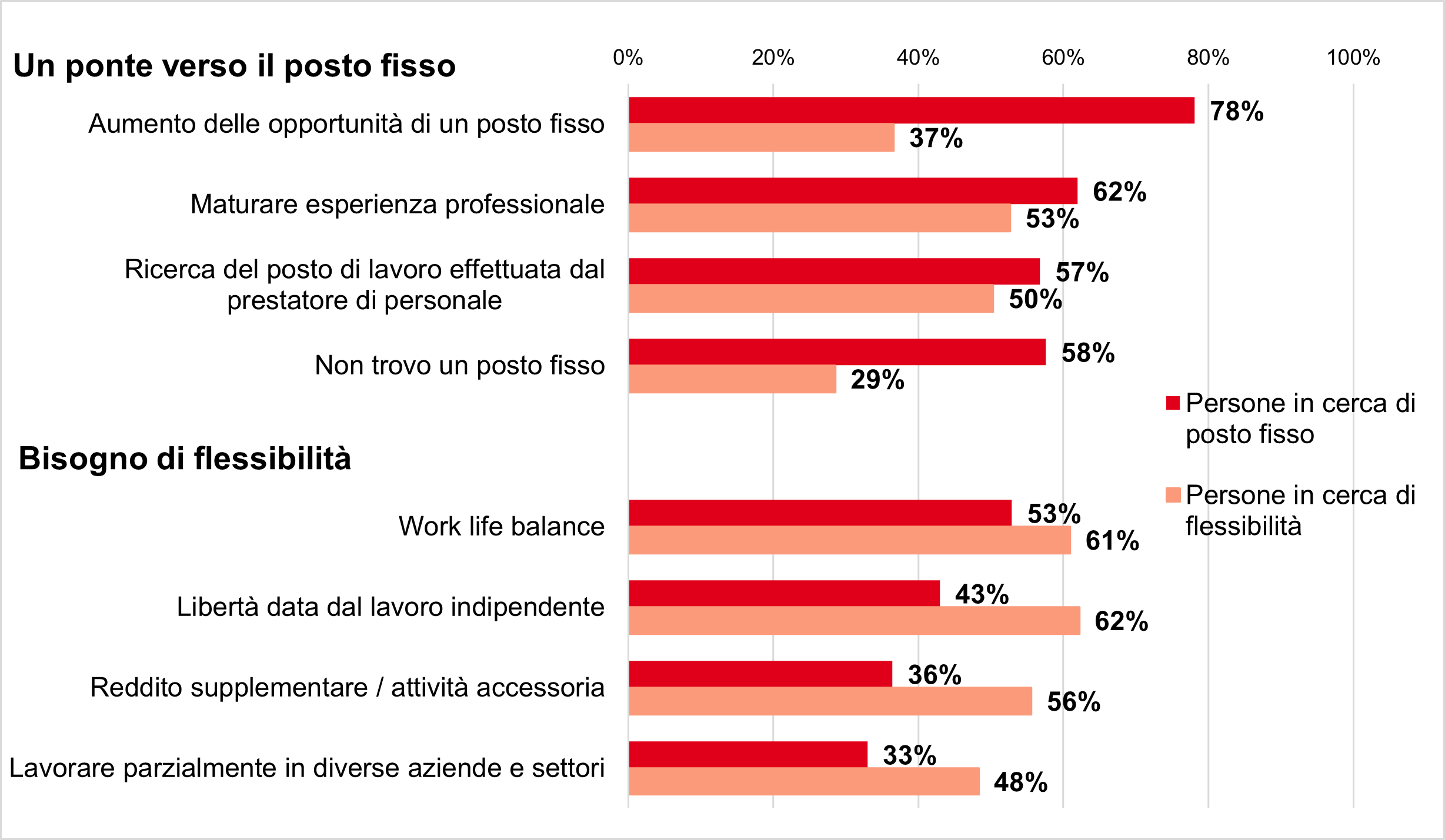 Base: lavoratori temporanei in cerca di un posto di lavoro fisso: 4134 persone, lavoratori temporanei in cerca di flessibilità: 1878 persone.