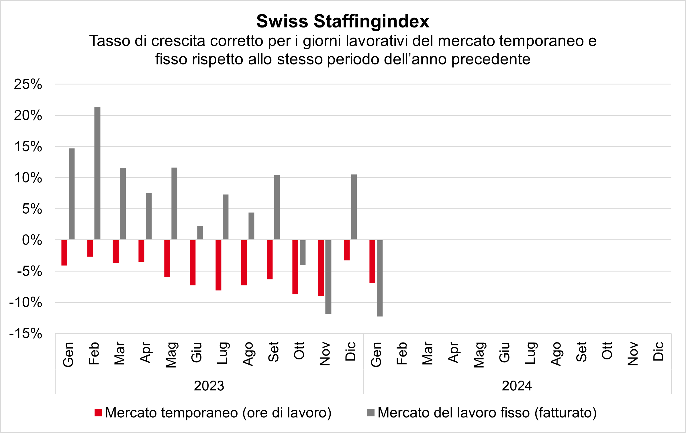 Inizio tempestoso nel 2024 per il settore del collocamento temporaneo e a tempo indeterminato. Nel mese di gennaio il numero di ore lavorate nel settore del prestito di personale è diminuito del 6,9 % rispetto allo stesso mese dello scorso anno. Nel segmento dei collocamenti a tempo indeterminato si è registrato un calo di fatturato del 12,3 %. Ciò significa che il raffreddamento della congiuntura incide sul mercato del lavoro temporaneo: il rallentamento dell'economia si ripercuote sul mercato del lavoro generando cifre in rosso in entrambi i settori di attività dei prestatori di personale.