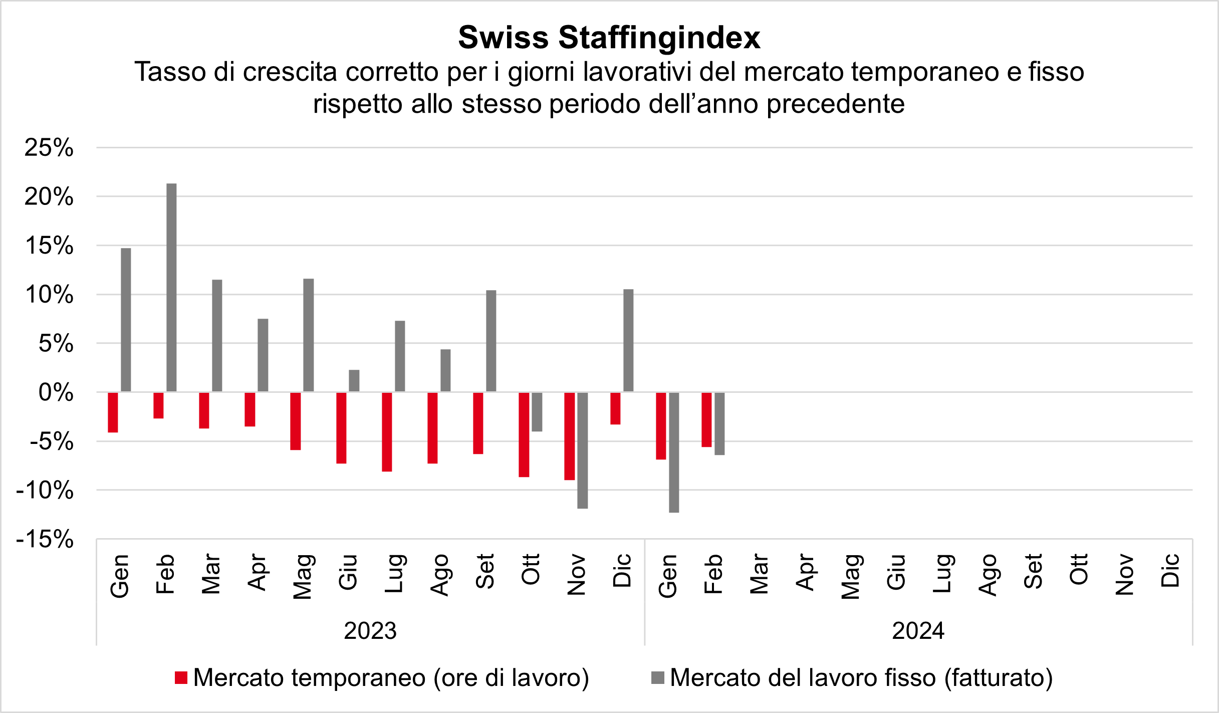 Prosegue anche a febbraio la discesa del mercato del lavoro temporaneo e a tempo indeterminato. Il numero di ore lavorate nel prestito di personale è diminuito del 5,6 per cento rispetto allo stesso mese dell'anno precedente. Il fatturato nel segmento dei collocamenti a tempo indeterminato ha subito un calo del 6,4 per cento. Il raffreddamento della congiuntura continua a gravare sul mercato del lavoro temporaneo: se da un lato la disponibilità di candidati sta migliorando, dall'altro diventa sempre più difficile trovare posizioni aperte nelle aziende acquisitrici.