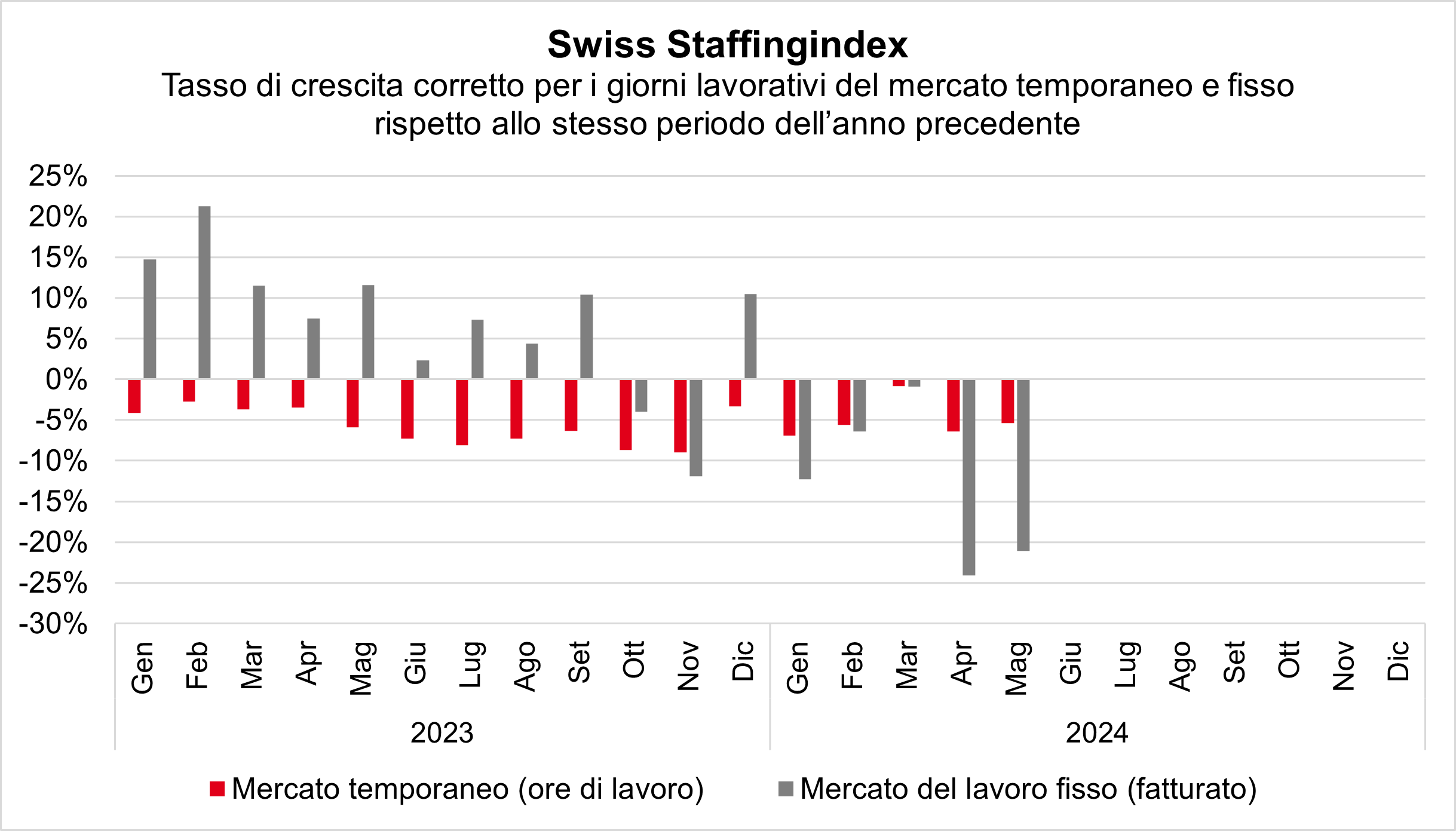 A maggio lo Swiss Staffingindex conferma il saldo negativo. Il mercato del lavoro temporaneo ha perso il 5,4 per cento rispetto all'anno precedente. Il mercato del lavoro fisso ha subito un calo dei fatturati del 21,1 per cento. Per i prestatori di personale in Svizzera le deboli tendenze di ripresa dell'economia globale non sono ancora percepibili. Al contrario: il doppio declino nel mercato del lavoro temporaneo e nel mercato del lavoro fisso è un chiaro segnale di recessione economica.