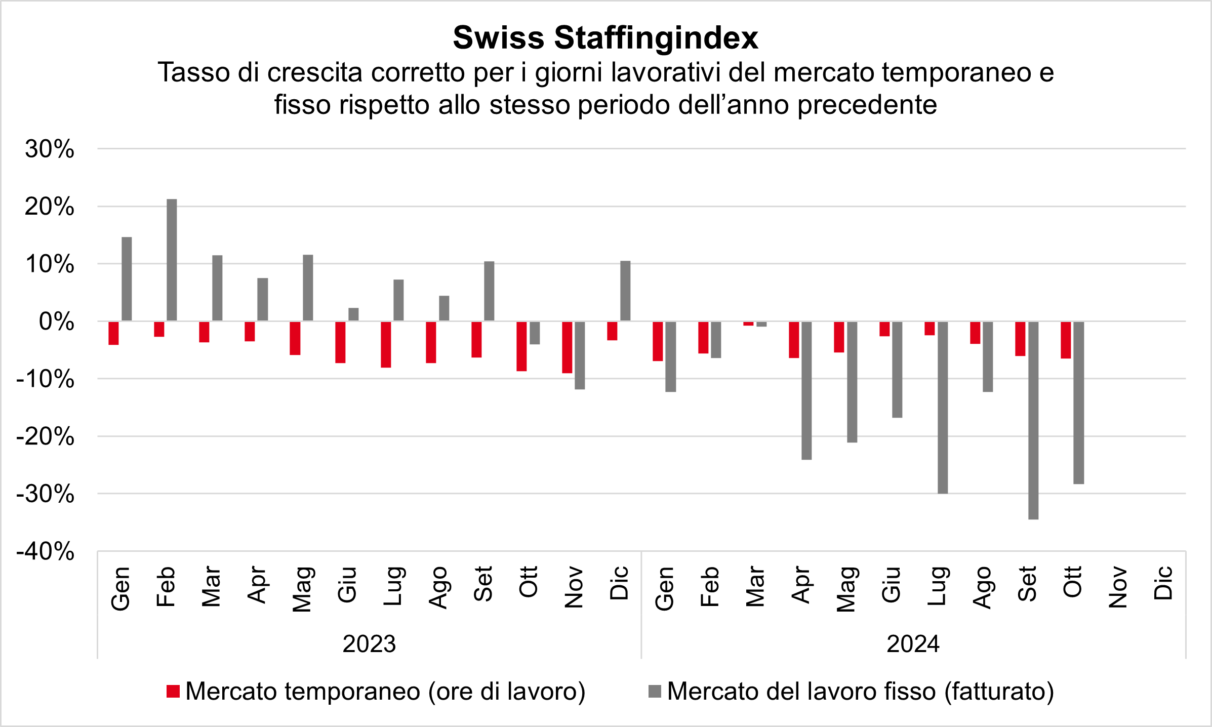 A ottobre il mercato del lavoro temporaneo si è fatto di nuovo cupo. Con una flessione del 6,5 % rispetto all'anno precedente si è registrato un calo crescente rispetto ai mesi prima. Il settore maggiormente colpito è il collocamento a tempo indeterminato. Lo scorso mese il mercato ha subito una contrazione del 28,3 %. In entrambi i sottomercati le cifre in rosso rispecchiano l'attuale rallentamento congiunturale.