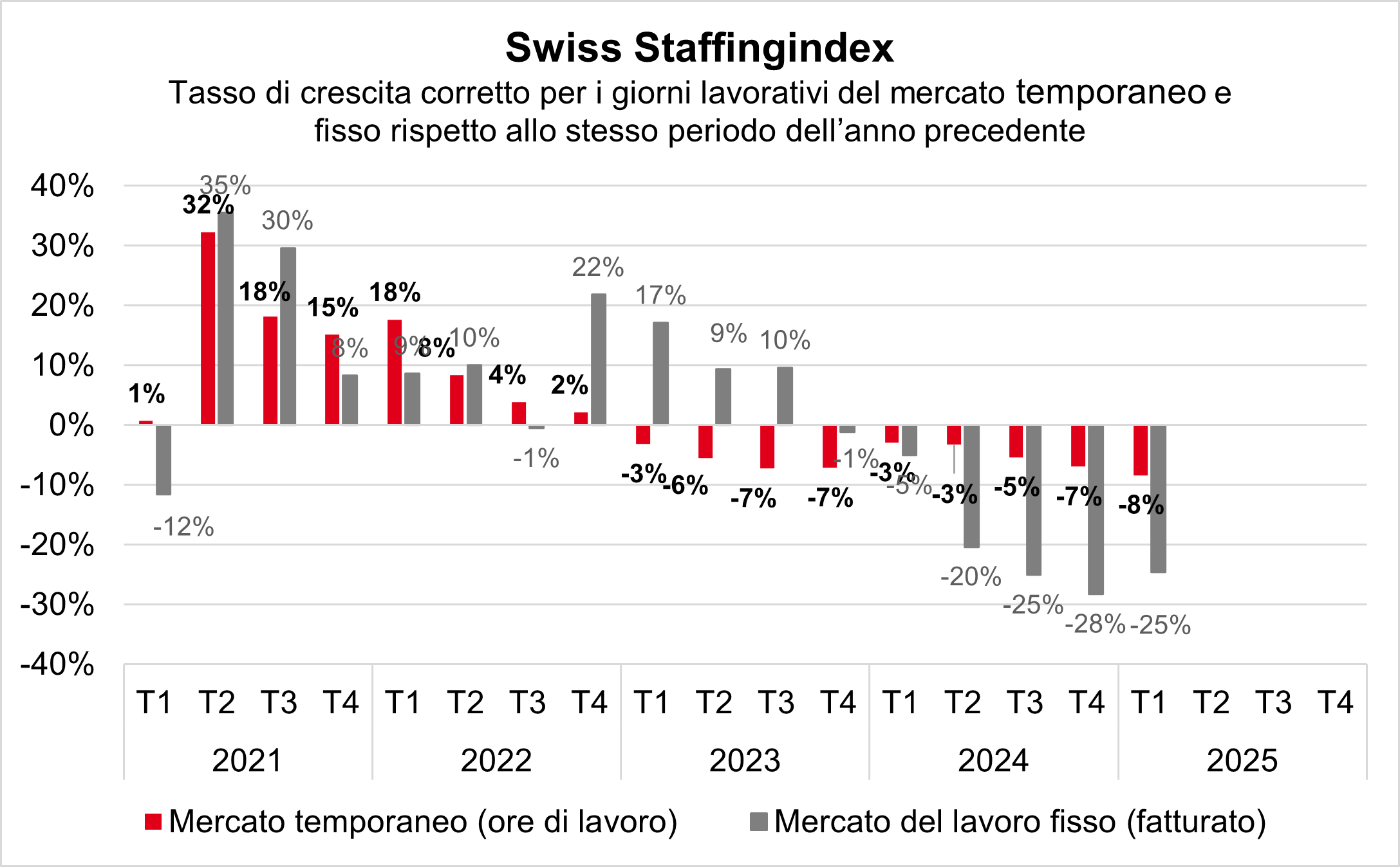 I prestatori di personale hanno iniziato il 2025 con un bilancio negativo nel primo trimestre. Per il mercato del lavoro temporaneo l'esercizio si apre in rosso per la terza volta consecutiva. Nel prestito di personale le ore lavorate sono diminuite dell'8,4 per cento. Il mercato del lavoro a tempo indeterminato ha registrato un crollo del 24,6 per cento. Di conseguenza i fornitori di personale, in quanto settore tradizionalmente sensibile alle variazioni congiunturali, avvertono in modo particolare l'incertezza economica. La politica dei dazi statunitense voluta dall'attuale presidente Donald Trump sta alimentando questo sviluppo in un momento in cui la congiuntura è già in fase di rallentamento e i rischi geopolitici restano elevati.