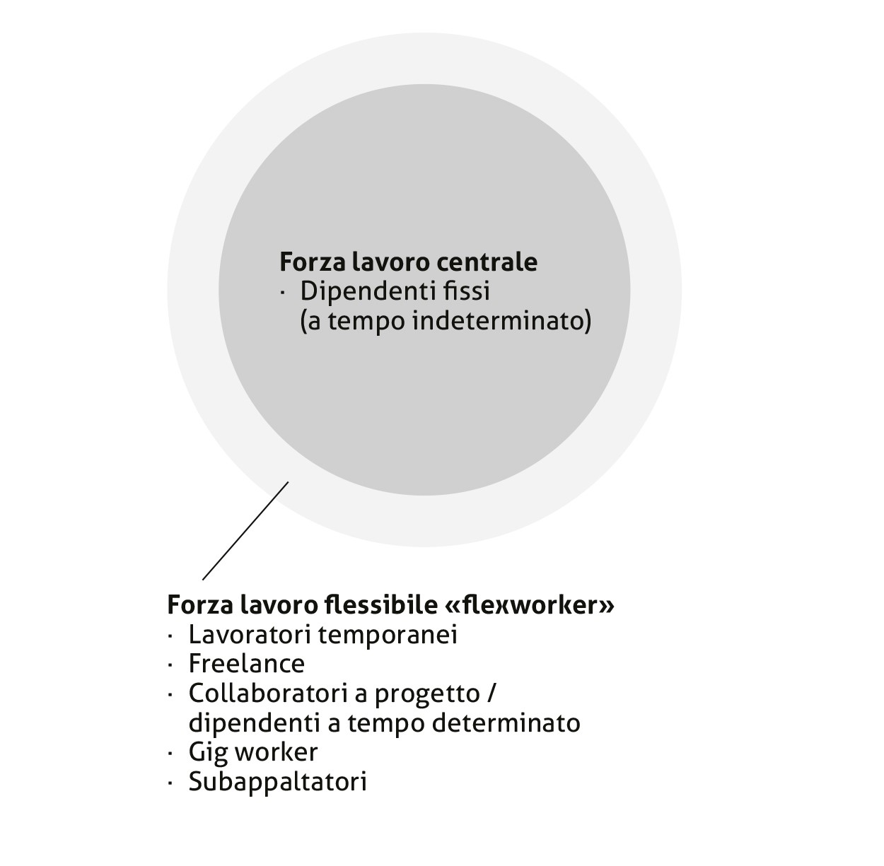 Il modello HR della forza lavoro flessibile (v. fig. 1) unisce due approcci: combina una forza lavoro centrale con una forza lavoro flessibile, così da poter coniugare stabilità e adattabilità. Mentre i dipendenti fissi assicurano le competenze di base e le conoscenze cruciali in seno all'azienda, i «flexworker» consentono una repentina reattività alle fluttuazioni congiunturali, apportando il know-how necessario a breve termine.