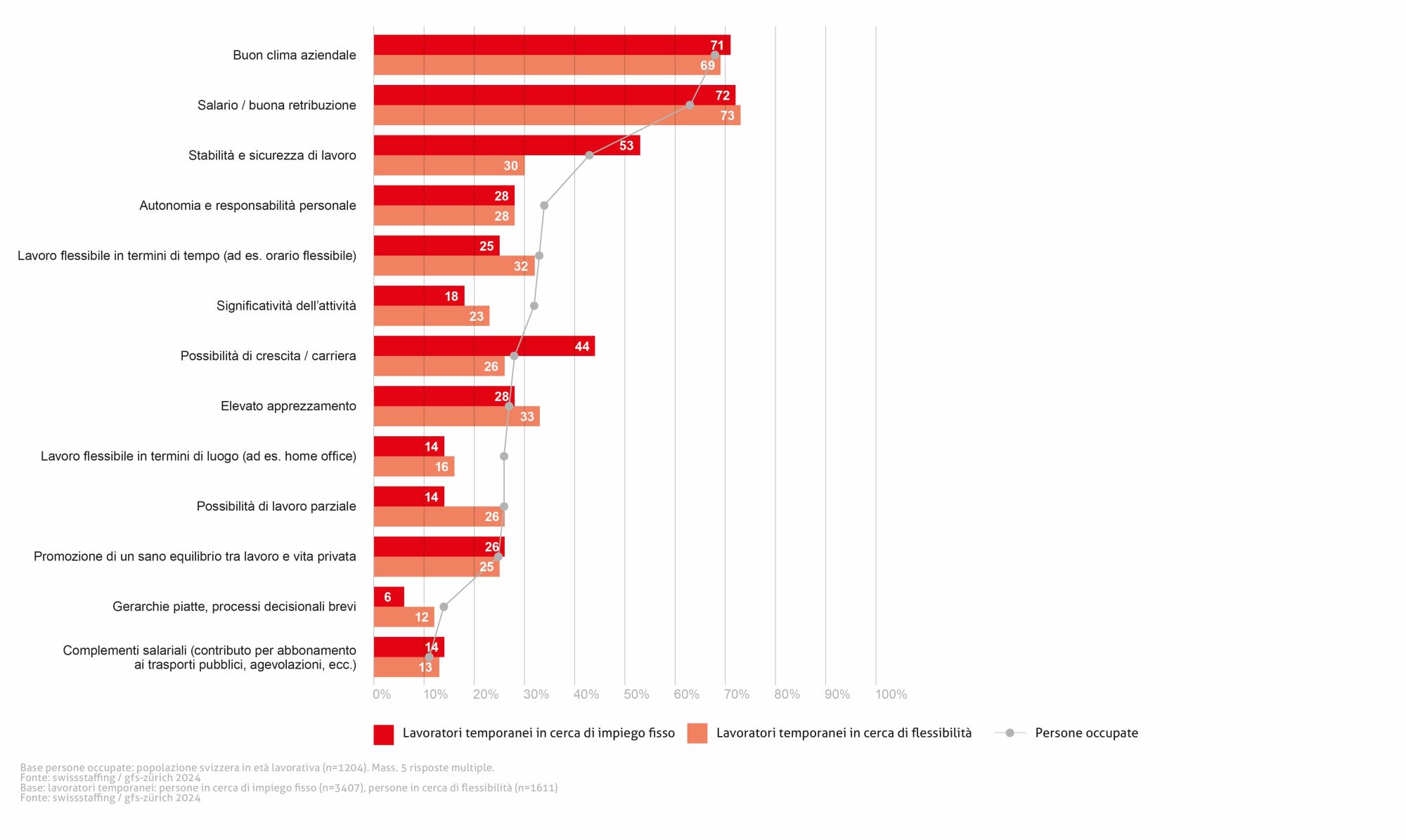 2) coloro che cercano la flessibilità e che, viceversa, non ambiscono al posto fisso. Questi ultimi apprezzano la flessibilità e l'autonomia e desiderano rimanere parte della forza lavoro flessibile. Per loro gli impieghi temporanei non sono una soluzione provvisoria, quanto piuttosto un'espressione di autodeterminazione professionale. Danno importanza all'approvazione (33 %), a un orario di lavoro flessibile (32 %) nonché alla possibilità di lavorare part time (26 %).
