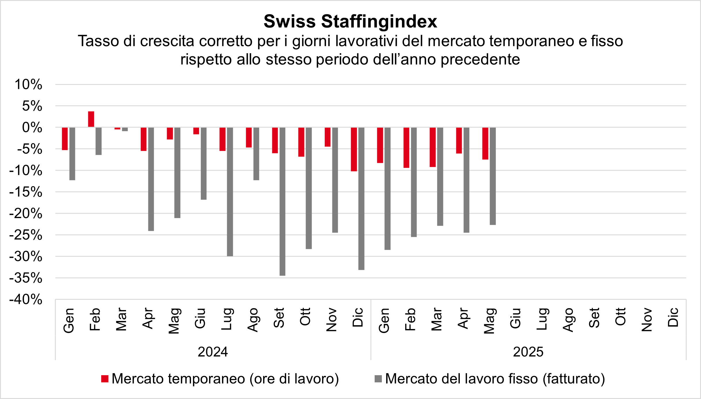 A maggio il mercato dei prestatori di personale si è mantenuto in rosso. Il numero di ore di lavoro nel settore del lavoro temporaneo è diminuito del 7,5 per cento rispetto all'anno precedente. Il fatturato nel segmento dei collocamenti a tempo indeterminato ha subito un calo del 22,7 per cento. Il contesto di mercato si conferma difficile. Oltre al raffreddamento congiunturale in generale, all'imprevedibile politica dei dazi statunitense e alla guerra in Ucraina, il conflitto in Medio Oriente rappresenta un'ulteriore minaccia per lo sviluppo economico futuro.