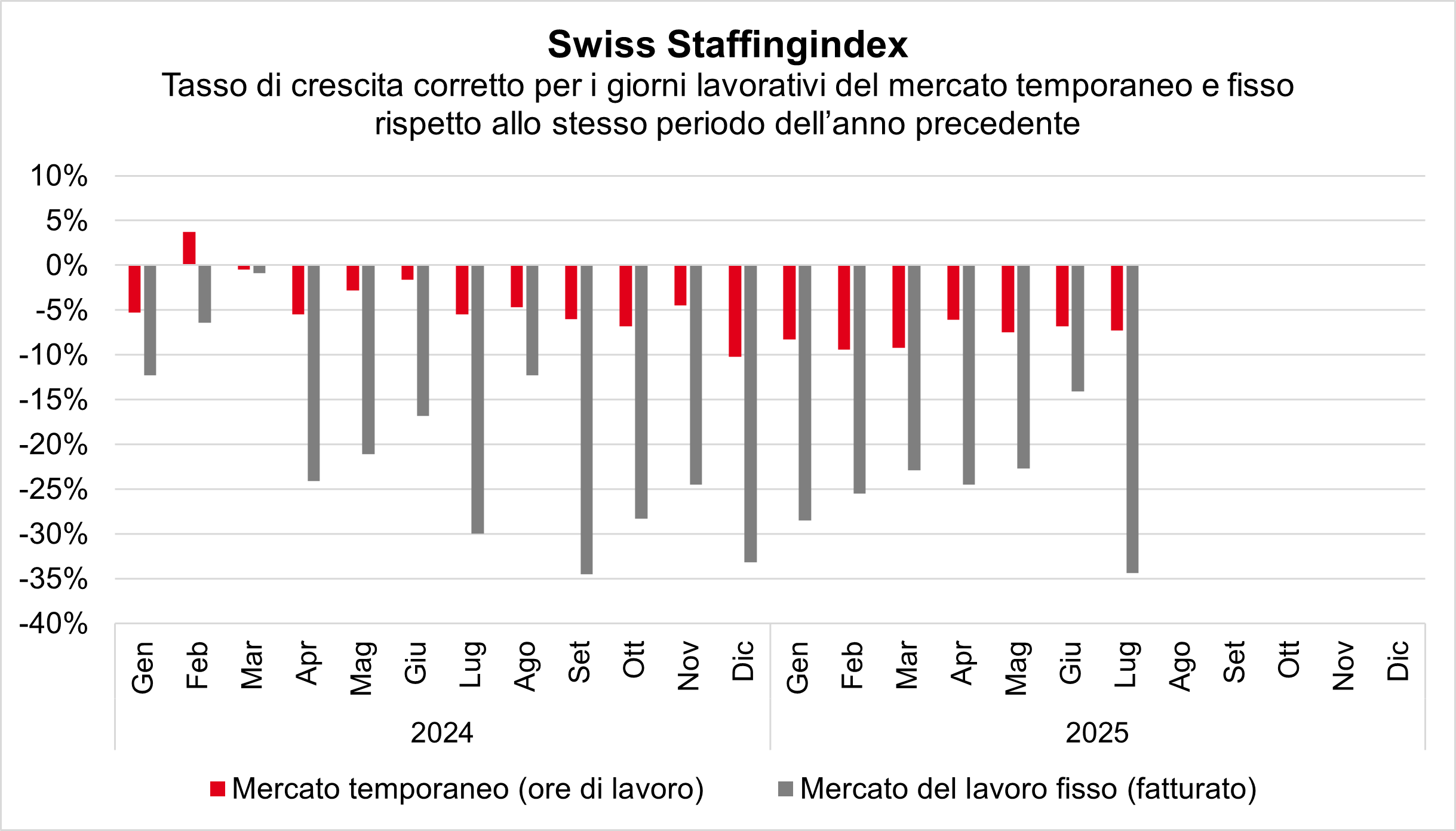 A luglio sia il mercato del lavoro temporaneo che quello a tempo indeterminato hanno registrato ulteriori contrazioni. Le ore lavorate nel segmento temporaneo sono diminuite del 7,3 per cento rispetto allo stesso mese dello scorso anno. Il fatturato generato nel collocamento a tempo indeterminato ha subito un crollo del 33,4 per cento. Ciò dimostra che già prima dello shock dei dazi statunitensi i prestatori di personale si trovavano ad affrontare un mercato in contrazione. Considerando il forte posizionamento del settore temporaneo nell'industria, è probabile che l'andamento rimanga negativo anche nei prossimi mesi.