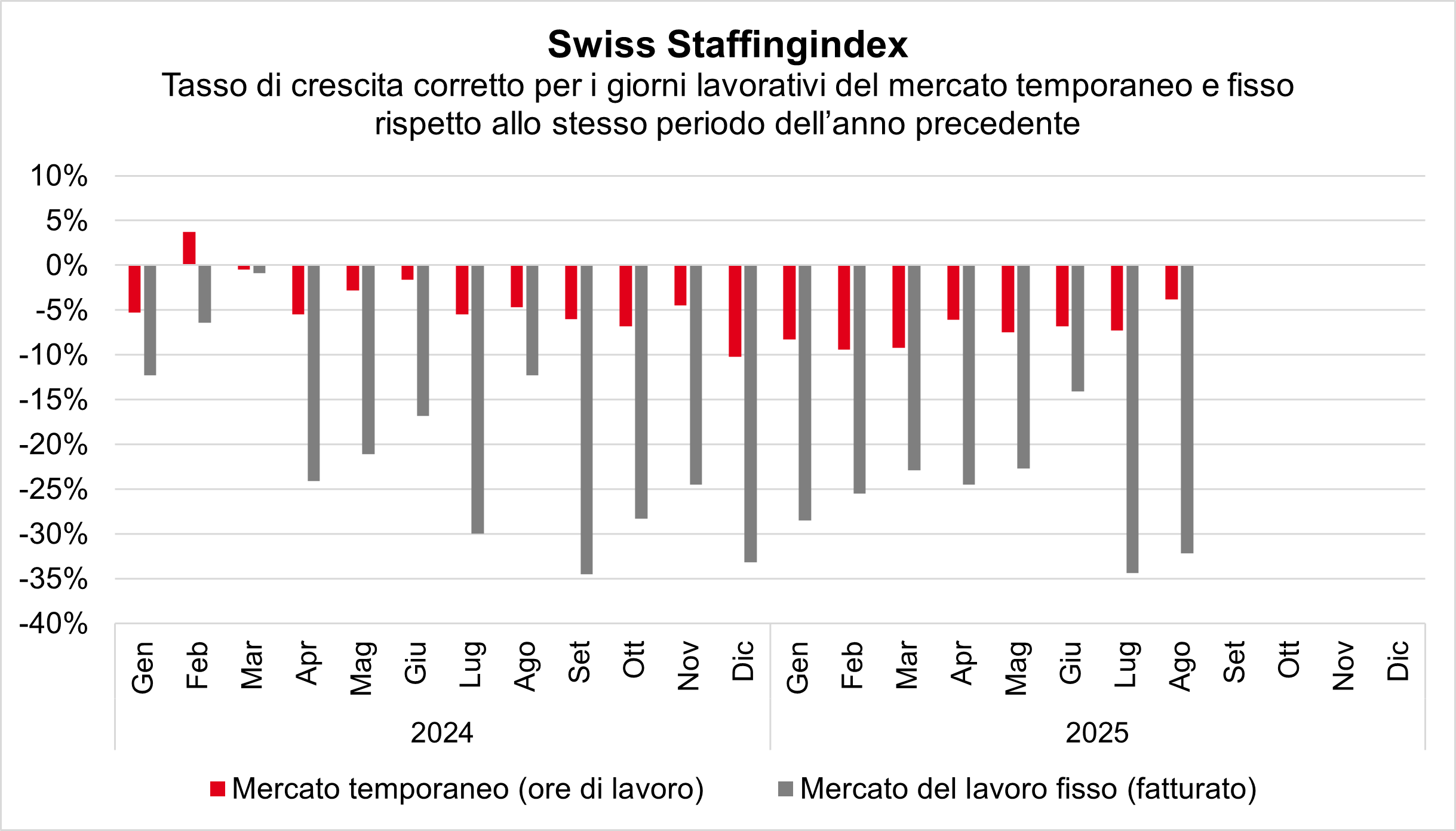 In agosto il mercato del lavoro temporaneo ha registrato un calo sensibilmente più contenuto. Il numero di ore di lavoro nel settore del lavoro temporaneo è diminuito del 3,8 per cento rispetto all'anno precedente – la contrazione più lieve dall'inizio dell'anno. La situazione nel mercato del lavoro a tempo indeterminato resta sotto pressione. Il fatturato generato nel collocamento a tempo indeterminato ha subito un crollo del 32,2 per cento. In agosto, quindi, lo shock dei dazi statunitensi ha inciso molto meno di quanto inizialmente temuto.