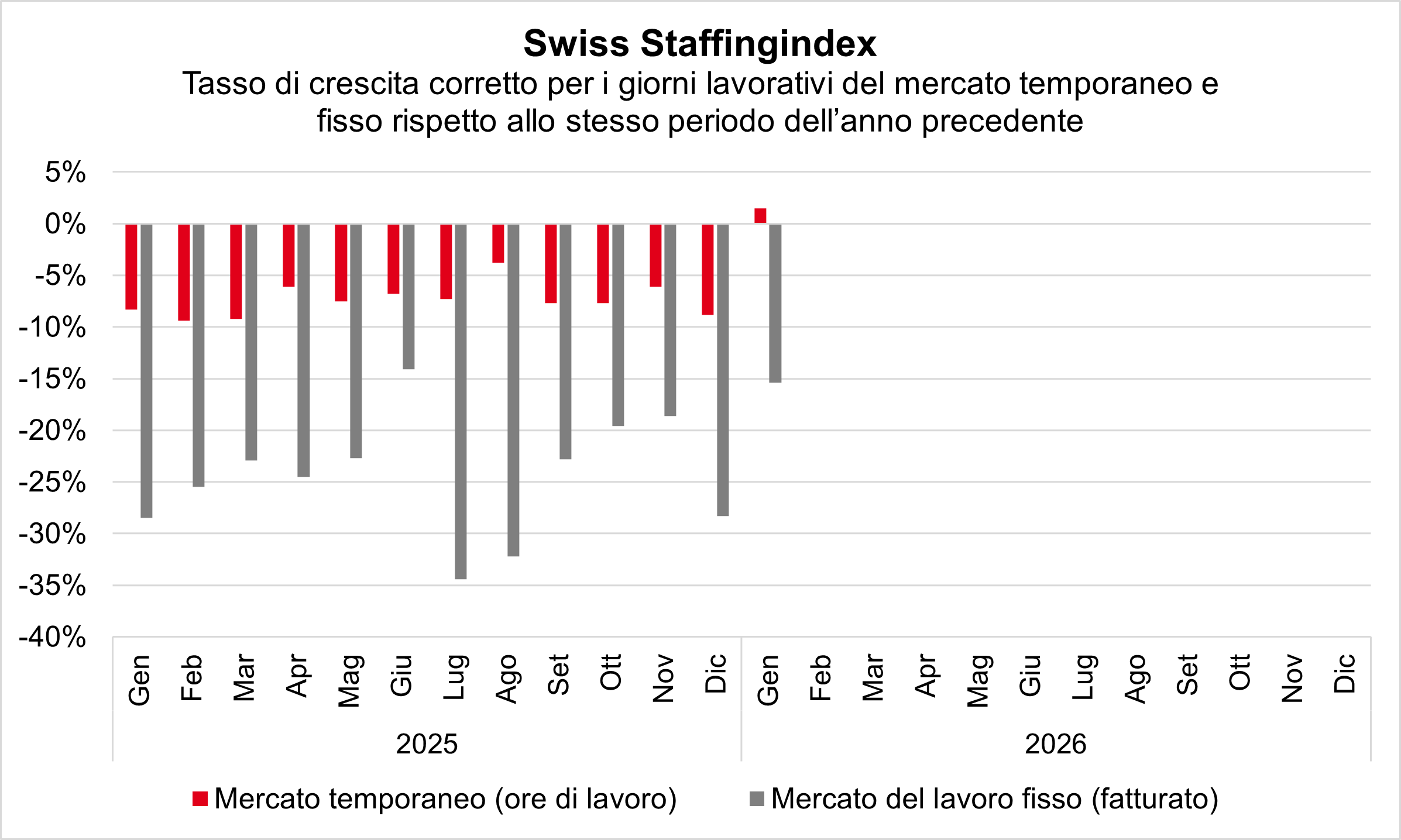A gennaio si è registrato un incremento dell'1,5 per cento delle ore di lavoro prestate rispetto allo stesso mese dell'anno precedente. Per la prima volta da dicembre 2022 lo Swiss Staffingindex torna in territorio positivo. La lieve ripresa sembra indicare una stabilizzazione nel settore del prestito di personale. Il calo registrato nelle attività del collocamento a tempo indeterminato è rimasto invece marcato, attestandosi al -15,4 per cento. Uno dei motivi potrebbe essere che i prestatori di personale, in particolare quelli di piccole e medie dimensioni, si concentrano sul lavoro temporaneo.