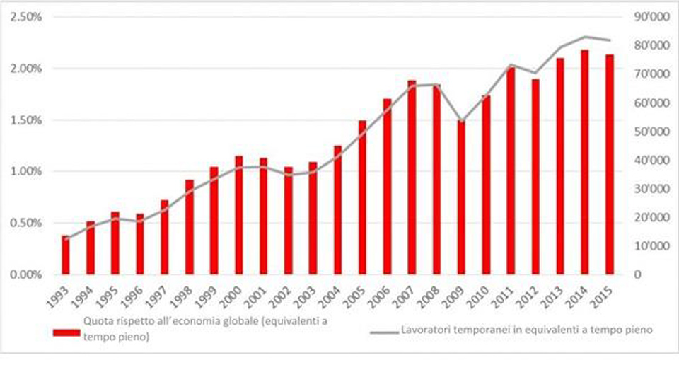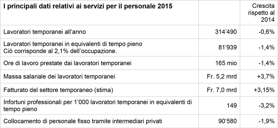 Legenda: nel 2015 i lavoratori temporanei hanno prestato 165 milioni di ore di lavoro, che corrispondono a 81'939 posti a tempo pieno. Circa il 2,1% di tutti i lavoratori è temporaneo.