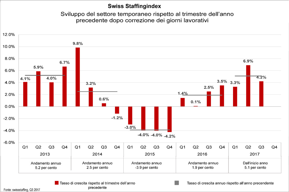 I tassi di crescita del settore temporaneo sono delle buone novità con duplice impatto. Le persone in cerca d'impiego si reintegrano facilmente nella vita professione tramite un impiego temporaneo e pongono un fondamento importante per ritornare velocemente ad un impiego fisso. In secondo luogo l'esperienza ci insegna che i tassi di crescita dei lavoratori temporanei in aumento sono un indicatore importante per i libri degli ordini pieni e portano a un aumento dell'occupazione. La preoccupazione che l'aumento del lavoro temporaneo porti ad una forma di lavoro flessibile non è fondata, bensì crea un'opportunità per tante persone in cerca d'impiego in Svizzera.