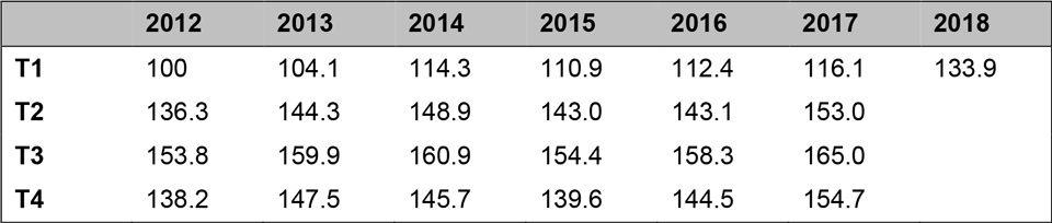 Panoramica dello sviluppo dell'indice Swiss Staffingindex, base: T1 2012
