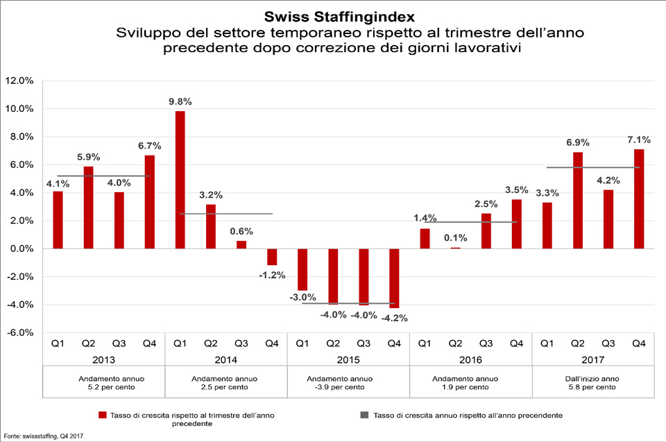 Dietro ai buoni risultati si celano tuttavia anche dei rischi: il numero delle abitazioni sfitte in aumento e la migrazione in calo potrebbero condurre a un surriscaldamento del settore edilizio, un settore cardine per le imprese di lavoro temporaneo. Inoltre gli sforzi profusi per limitare l'occupazione temporanea minacciano di distruggere per primi gli importanti posti per l'inserimento professionale. Tuttavia lo sviluppo favorevole dell'economia globale e la ripresa della crescita in Svizzera fanno sperare in un anno 2018 proficuo per il settore del lavoro temporaneo. Marius Osterfeld, economista presso swissstaffing, stima che: «Qualora il nesso storico tra crescita del PIL e Swiss Staffingindex trovasse conferma, nel 2018 il settore potrebbe nuovamente registrare una crescita del 5,8 per cento».