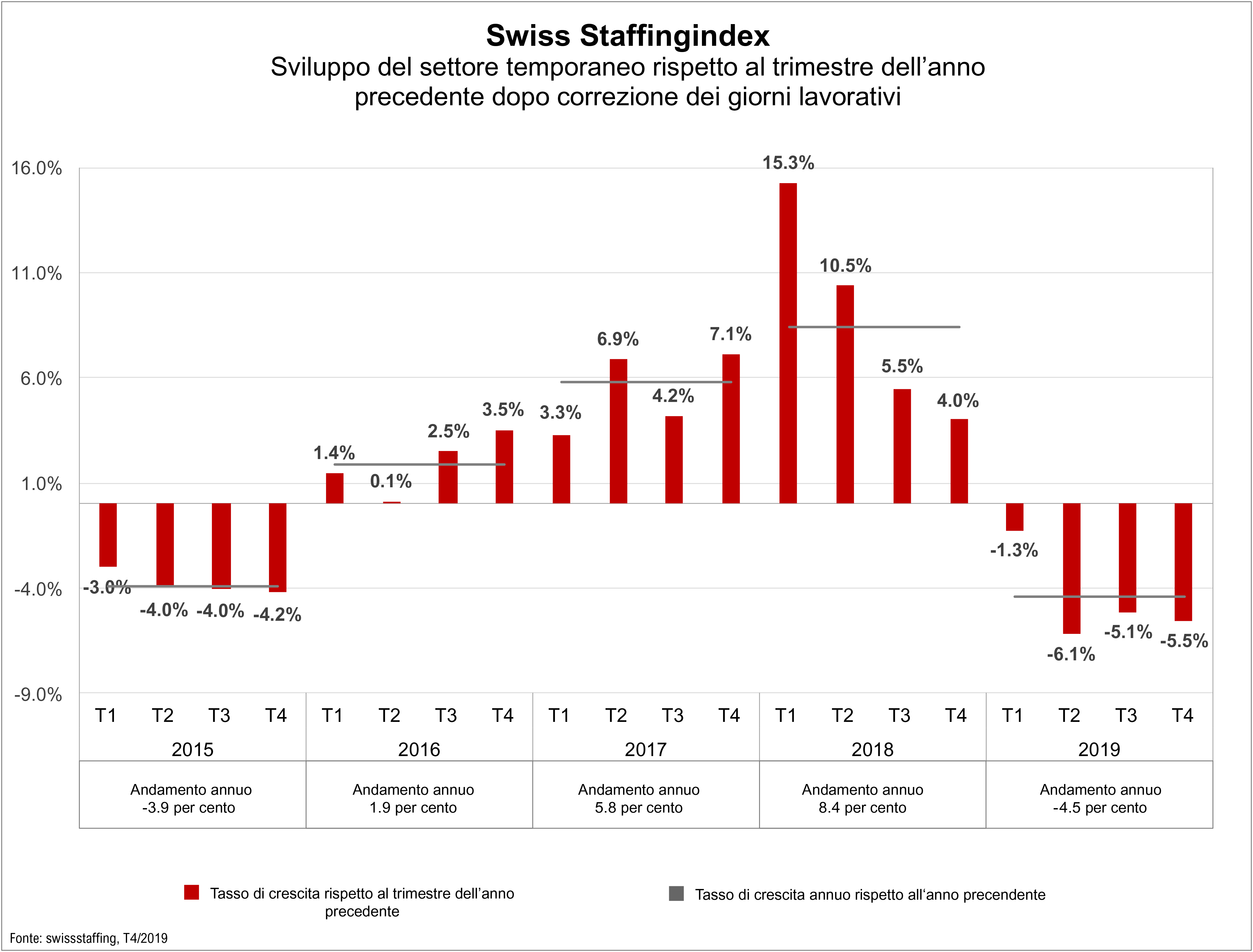Nel 2019 i lavoratori temporanei hanno prestato il 4,5% di ore di lavoro in meno rispetto all'anno record 2018. Le ragioni di questo calo sono riconducibili a un mercato del lavoro inaridito e alla dinamica stagnante dell'economia svizzera. Per le imprese di lavoro temporaneo diventerà più difficile da un lato assumere lavoratori temporanei e dall'altro inserirli nelle aziende, a causa della mancanza di domanda.