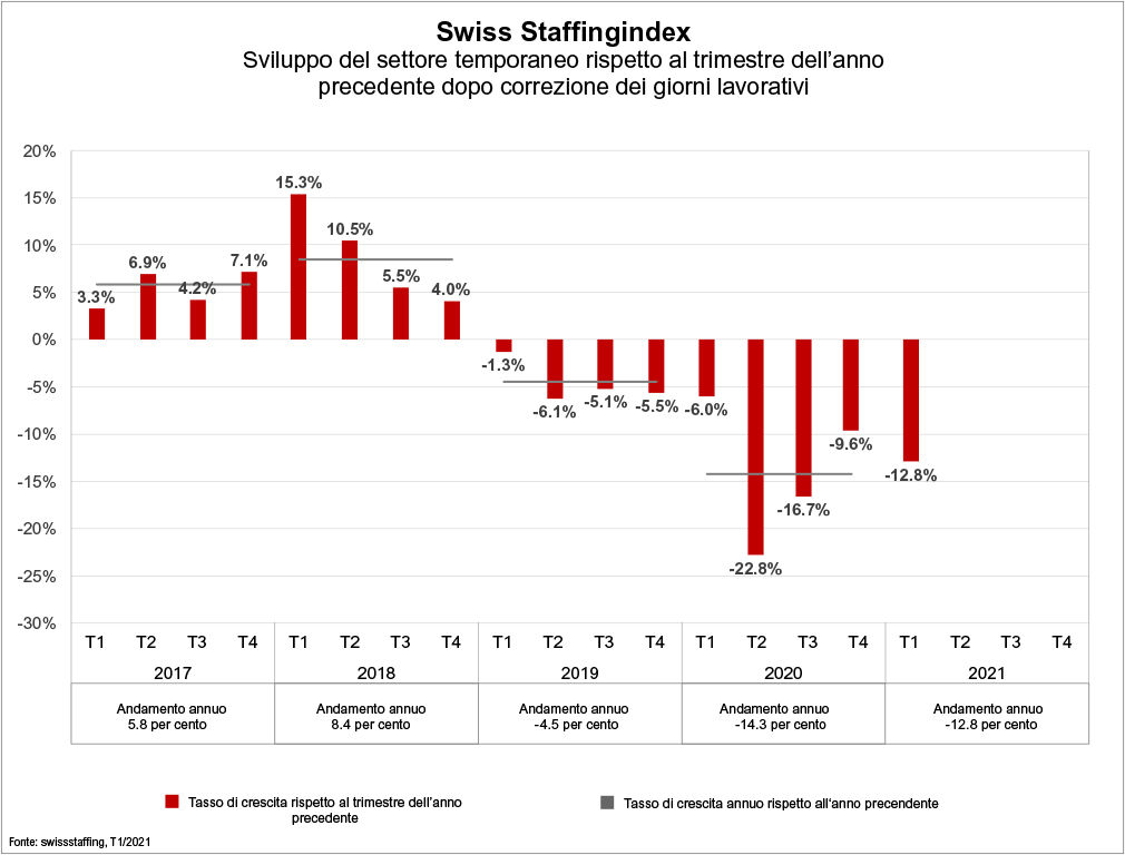 Nel primo trimestre 2021, le ore di lavoro temporaneo hanno fatto registrare una riduzione del 12,8% rispetto allo stesso periodo dell'anno precedente. La seconda serrata ha quindi spinto il settore temporaneo di nuovo nelle doppie cifre negative.