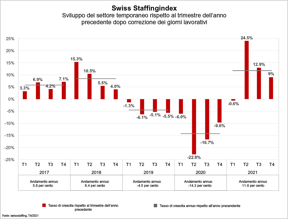 Il settore del lavoro temporaneo chiude il 2021 registrando un aumento dell'11,6 per cento, secondo il barometro settoriale Swiss Staffingindex. Il fabbisogno di personale nei centri vaccinali, nei centri di test e negli ospedali così come il migliorato stato degli affari nell'industria e nell'edilizia, dove i posti temporanei sono presto stati convertiti in posti fissi, hanno riportato il business sulla via della crescita. Anche i prestatori di personale hanno visto emergere nel 2021 nuove tendenze sul mercato del lavoro, innescate dalla crisi. Ciò include anche un boom delle formazioni continue e la fuga dei lavoratori freelance sotto l'egida del lavoro temporaneo. Nonostante la ripresa, il numero delle ore di lavoro prestate dai lavoratori temporanei è del 4,3 per cento al di sotto del livello pre-crisi e si scosta addirittura del 9 per cento dal picco raggiunto nel 2018.