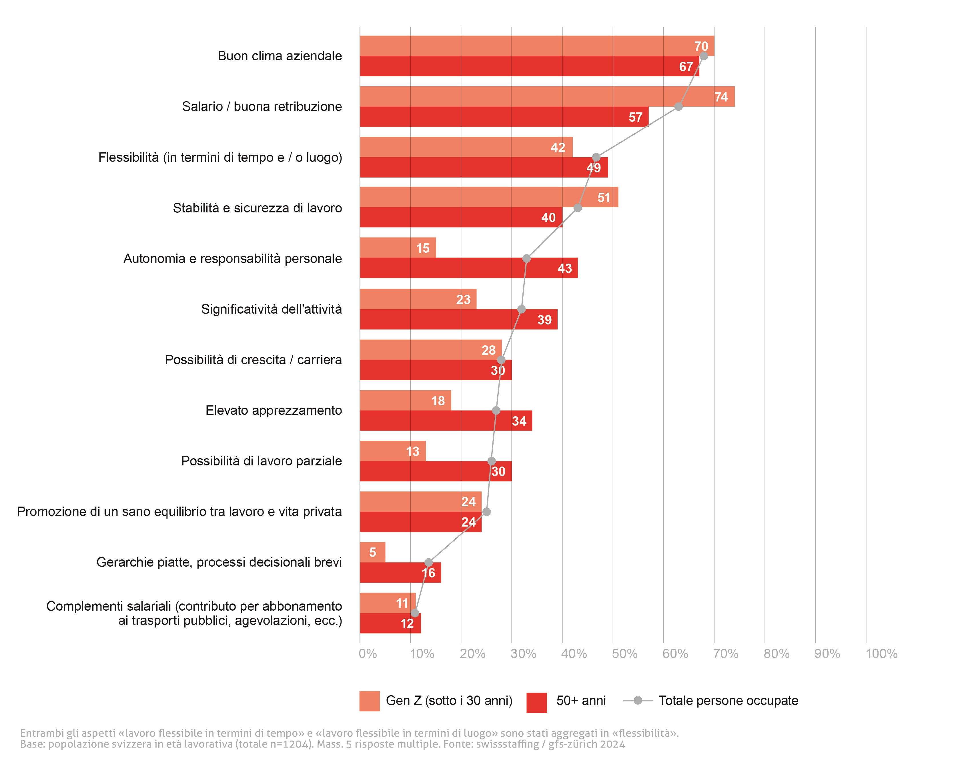Le priorità delle persone occupate variano fortemente in base all'età: per i giovani della Generazione Z, il salario è al primo posto e per loro la sicurezza del posto di lavoro è più importante che per qualsiasi altra fascia d'età. Al contrario, la generazione degli over 50 attribuisce maggiore importanza all'autonomia, alla flessibilità e alla significatività.